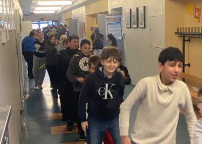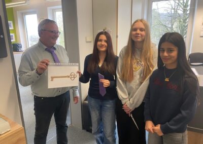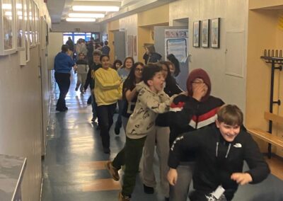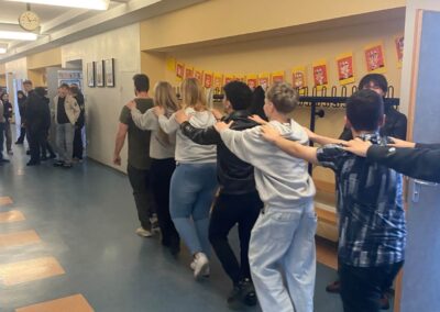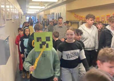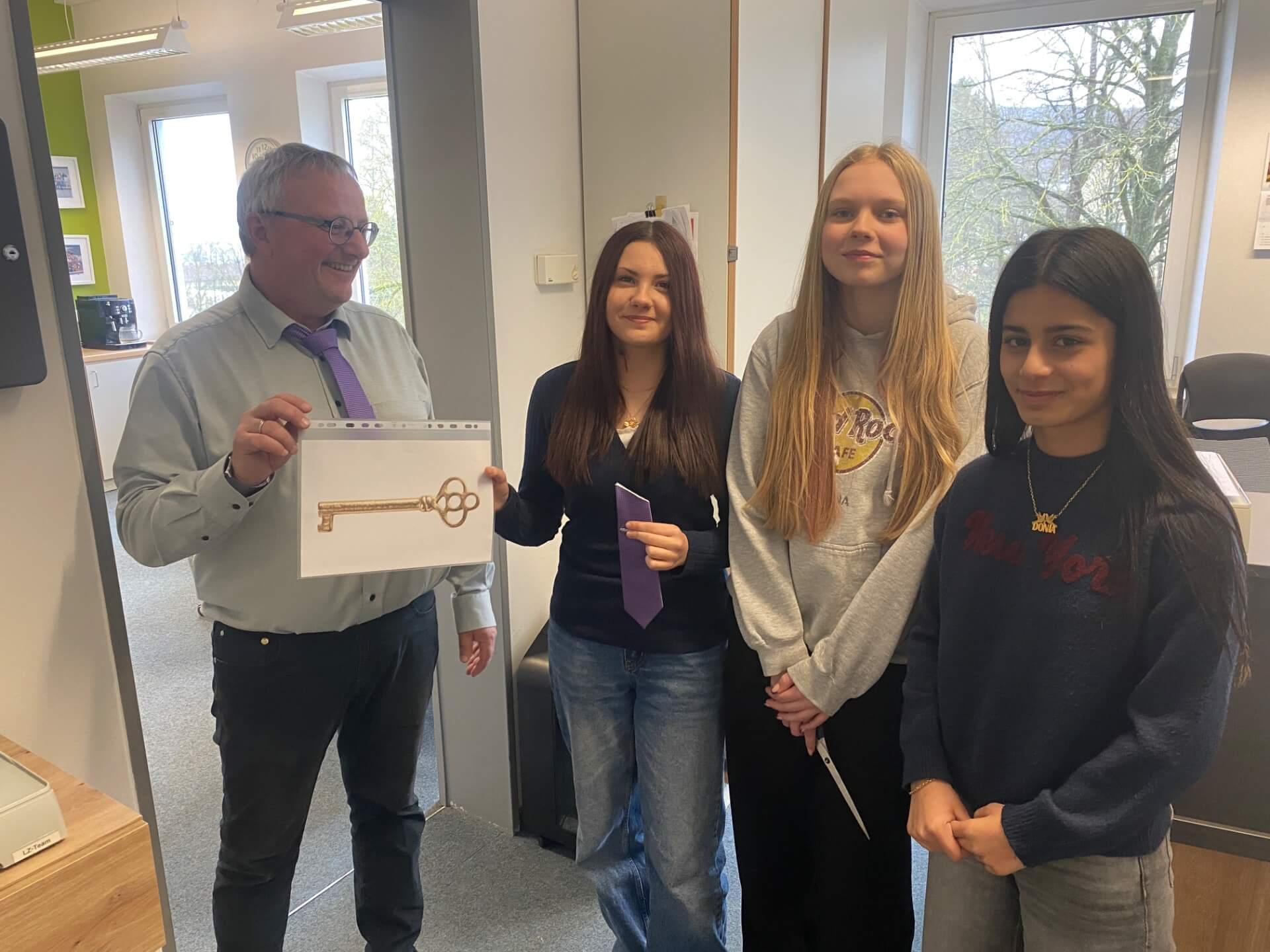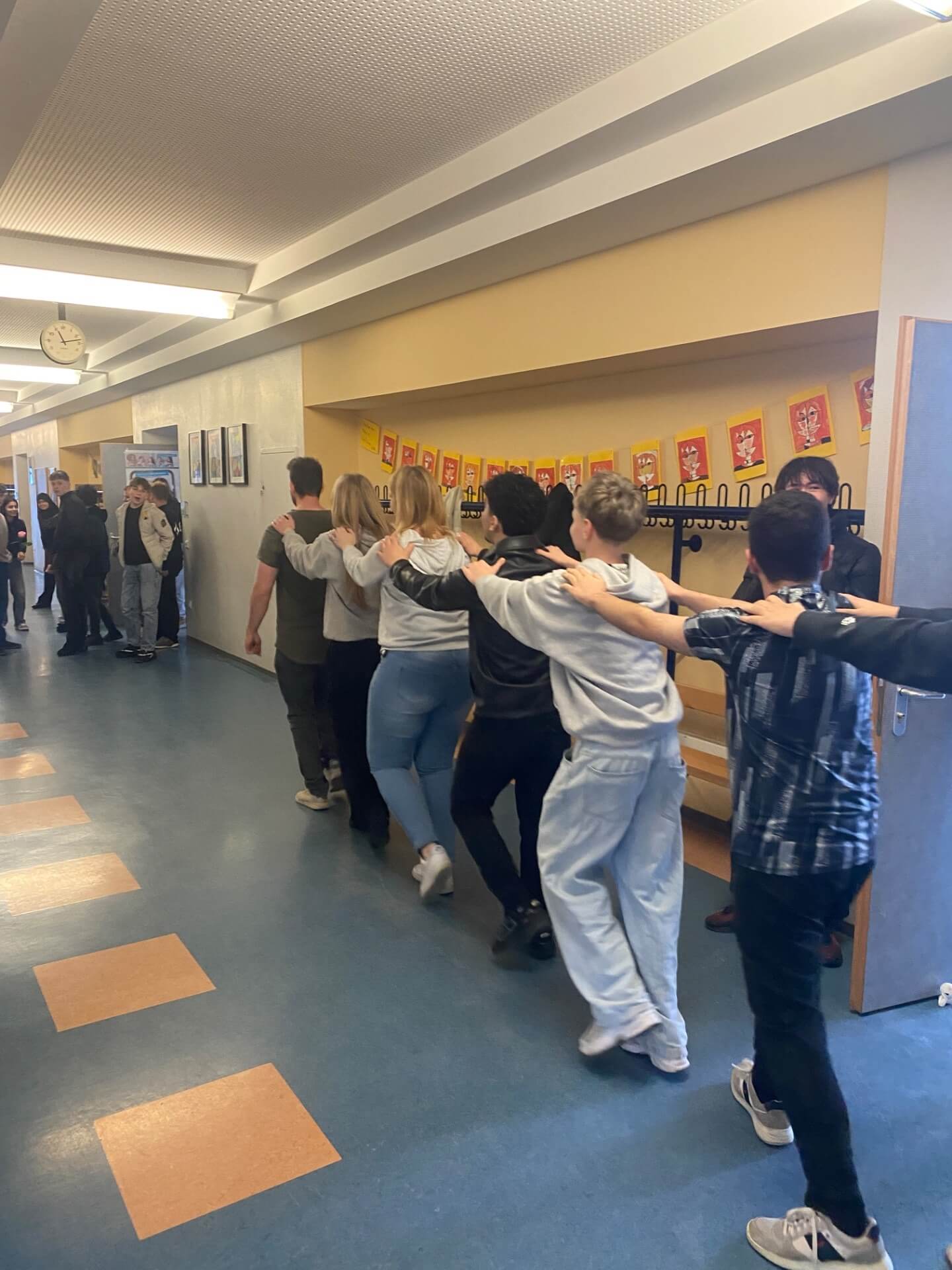 Heut gehts rund. Rektor Leitz hat nichts mehr zu melden. Die Schülerinnen übernehmen die Macht. Erst stürmen sie das Büro des Rektors, schneiden ihm die Krawatte ab, übernehmen den Schlüssel und beschließen ein vorzeitigen Unterrichtsschluss ab 13:45 Uhr. Die Mitschülerinnen und Mitschüler konnten es gar nicht glauben. Und dann ging die Party auf allen Ebenen los: Polonaise auf allen Ebenen.
